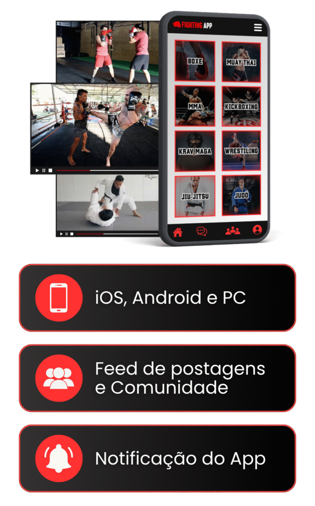 O Fighting App oferece mais de 600 videoaulas práticas das 16 artes marciais mais eficazes do mundo para você treinar onde quiser, no seu ritmo, sem precisar de equipamentos.